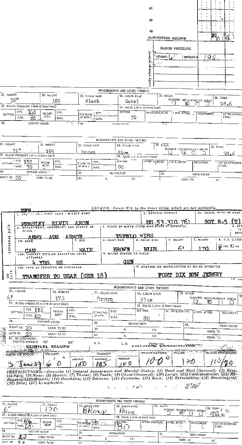 | Here are Elvis' Army physical records. He is listed at 6'. He was likely measured with his shoes on, giving him an extra inch or so. |